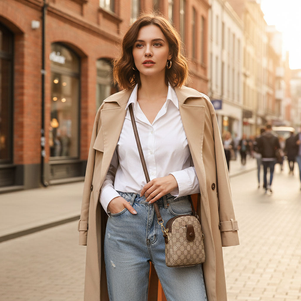 Compact and beautifully structured, it holds your essentials without compromise — just the right size at 14cm (5.5in) in length, 19.5cm (7.7in) in height, and 6cm (2.4in) in thickness. Its clean lines and retro-inspired silhouette make it a natural choice for days when you want understated sophistication and a touch of personality.